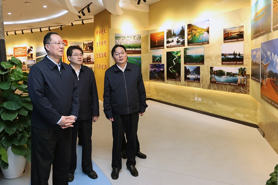 圖為毛偉明在水利科普展示中心參觀新中國成立70周年水利改革發(fā)展成就展。