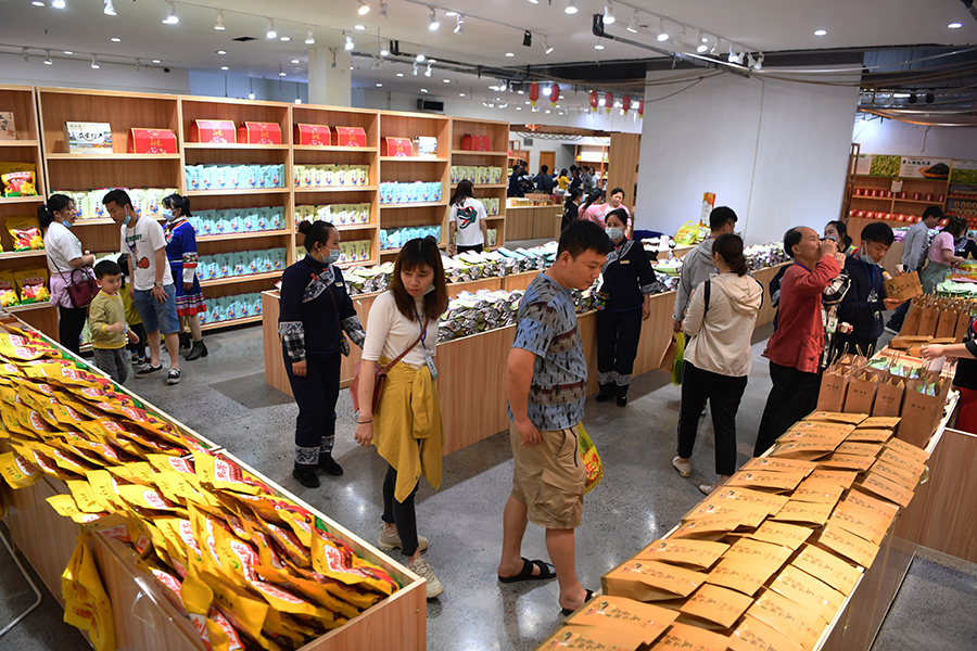 5月8日,鳳凰縣廖家橋鎮(zhèn)周生堂生物科技有限公司,游客在產(chǎn)品展示中心選購(gòu)農(nóng)特產(chǎn)品。近年,菖蒲塘村為拓寬銷(xiāo)售市場(chǎng),與民營(yíng)企業(yè)周生堂公司實(shí)施村企聯(lián)建,對(duì)村里的蜜柚、獼猴桃等農(nóng)產(chǎn)品實(shí)行保底收購(gòu),并以“菖蒲塘”品牌入股公司,占股5%,壯大了村集體經(jīng)濟(jì),同時(shí)安排了160多名村民就業(yè)。