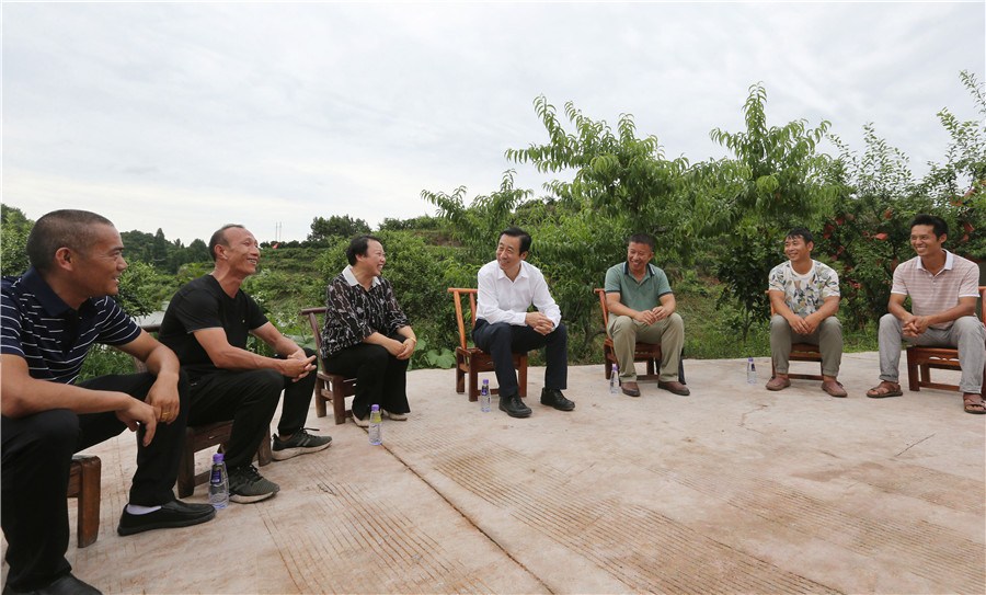 6月17日至18日,省委副書記、省長許達哲在懷化調(diào)研脫貧攻堅工作。圖為許達哲在楠木橋村返鄉(xiāng)農(nóng)民工創(chuàng)業(yè)基地黃桃園同村民座談。
