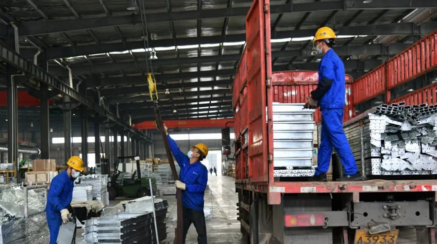 4月28日,在湘陰高新區(qū)元亨節(jié)能科技園,滿載冷卻塔的貨車一輛接著一輛從園區(qū)駛出。