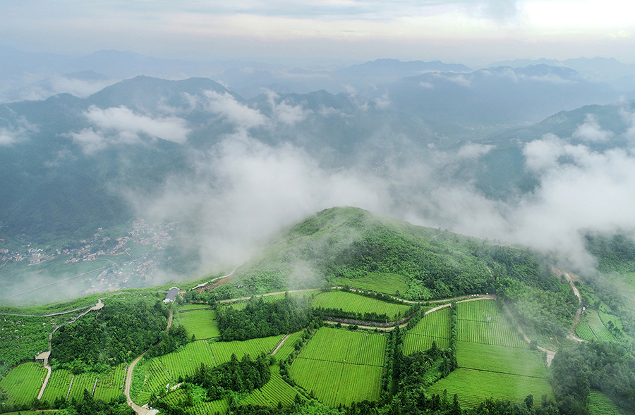 6月30日,安化縣馬路鎮(zhèn)云臺山頂,標(biāo)準(zhǔn)化的生態(tài)茶園與遠(yuǎn)山、云海、綠樹相互映襯。目前,茶產(chǎn)業(yè)已成為該縣脫貧攻堅(jiān)的重要支柱產(chǎn)業(yè)。
