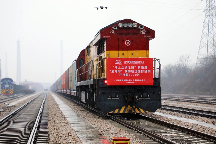 2月11日,一列滿載汽車配件的“湘粵非”鐵海聯(lián)運(yùn)國際班列從湖南長株潭口岸經(jīng)貿(mào)發(fā)展有限公司專用鐵路開出。這是自2021年“湘粵非”鐵海聯(lián)運(yùn)國際班列開行以來的第2000趟班列。去年,“湘粵非”班列運(yùn)輸貨物58299標(biāo)箱,同比增長23.9%;貨值增長達(dá)17.28%。孟祥琳 攝