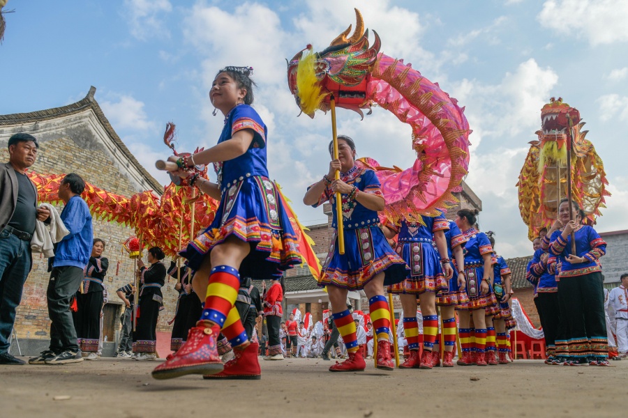 2月14日,江華瑤族自治縣大路鋪鎮(zhèn)神崗古村,村民在舞龍。當天,該村舉行馬年“村晚”,村民開展形式多樣的民俗活動喜迎新春,吸引眾多游客參與體驗。蔣克青 攝(湖南圖片庫)