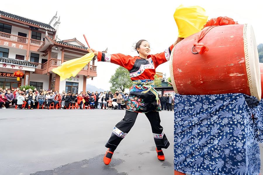 2月17日,吉首市石家沖街道寨陽村,村民打苗鼓歡慶新春。梁永鴻 攝(湖南圖片庫)