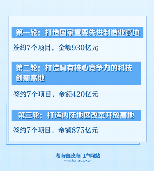 會(huì)上更是舉辦了三輪政銀企簽約。部分市州、重點(diǎn)園區(qū)、重點(diǎn)企業(yè)與金融機(jī)構(gòu)現(xiàn)場(chǎng)簽約21個(gè)重大項(xiàng)目,項(xiàng)目總金額達(dá)2225億元?!叭咚男隆睉?zhàn)略中的每個(gè)“高地”都配有7個(gè)相應(yīng)的項(xiàng)目。