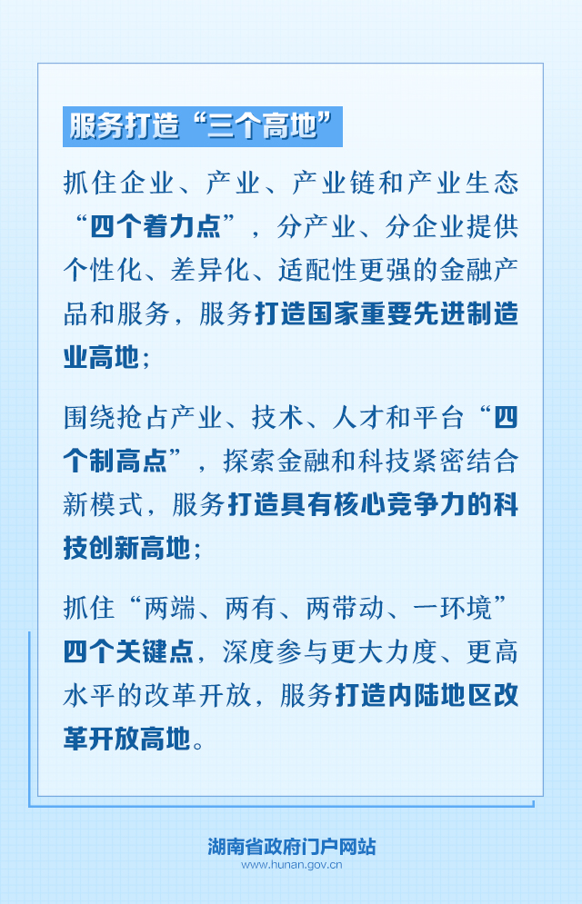 推進(jìn)金融業(yè)高質(zhì)量發(fā)展,是實(shí)施好“三高四新”戰(zhàn)略、建設(shè)現(xiàn)代化新湖南的重要支撐,各級(jí)各部門(mén)要將金融工作放在突出重要位置,用實(shí)際行動(dòng)扎實(shí)推動(dòng)金融資源加速向“三高四新”領(lǐng)域聚集,為“三高四新”戰(zhàn)略的實(shí)施插上這支極其重要的“金翅膀”。