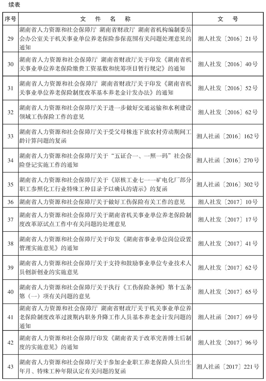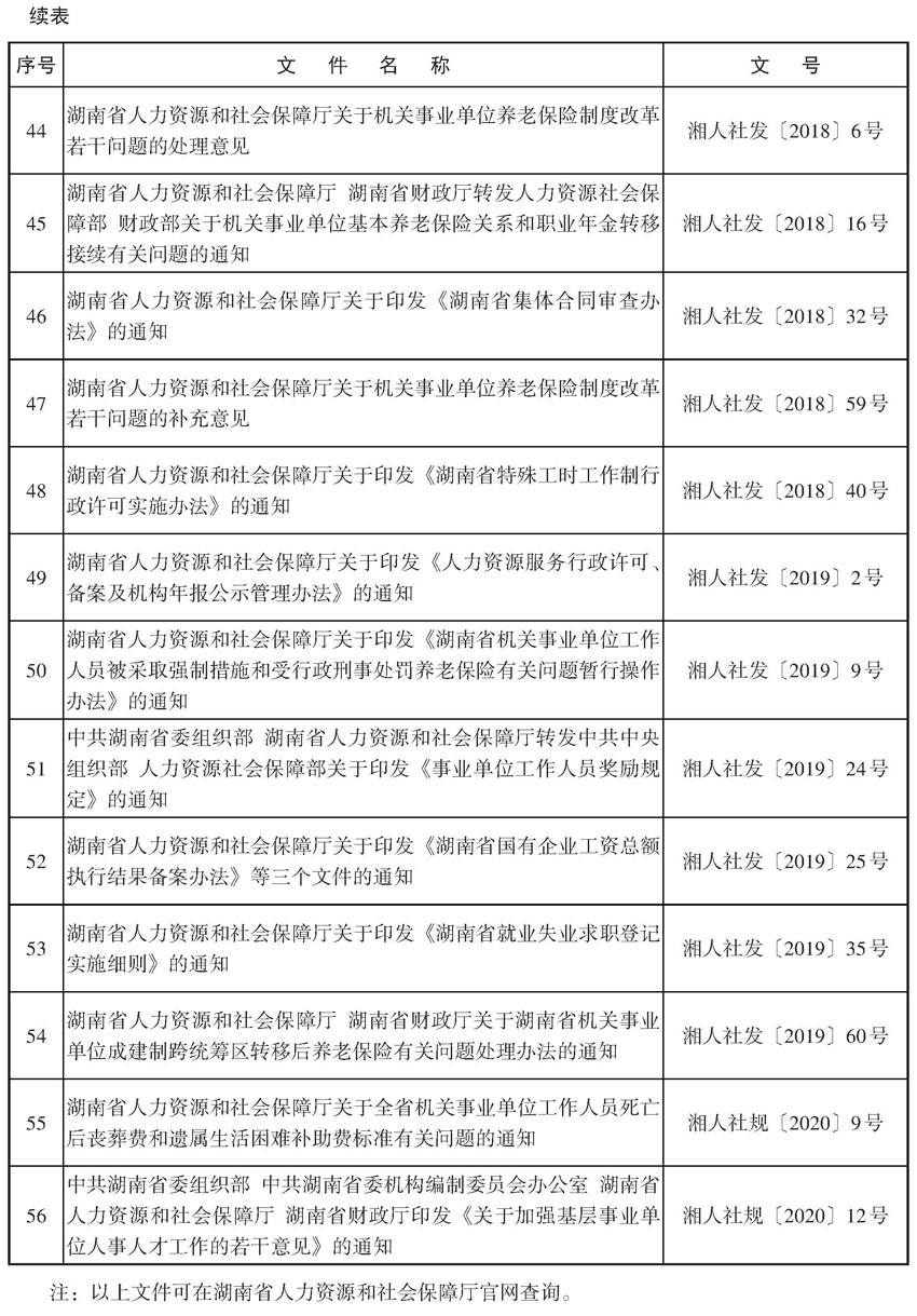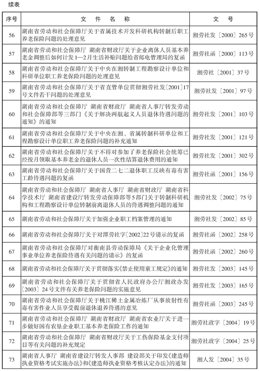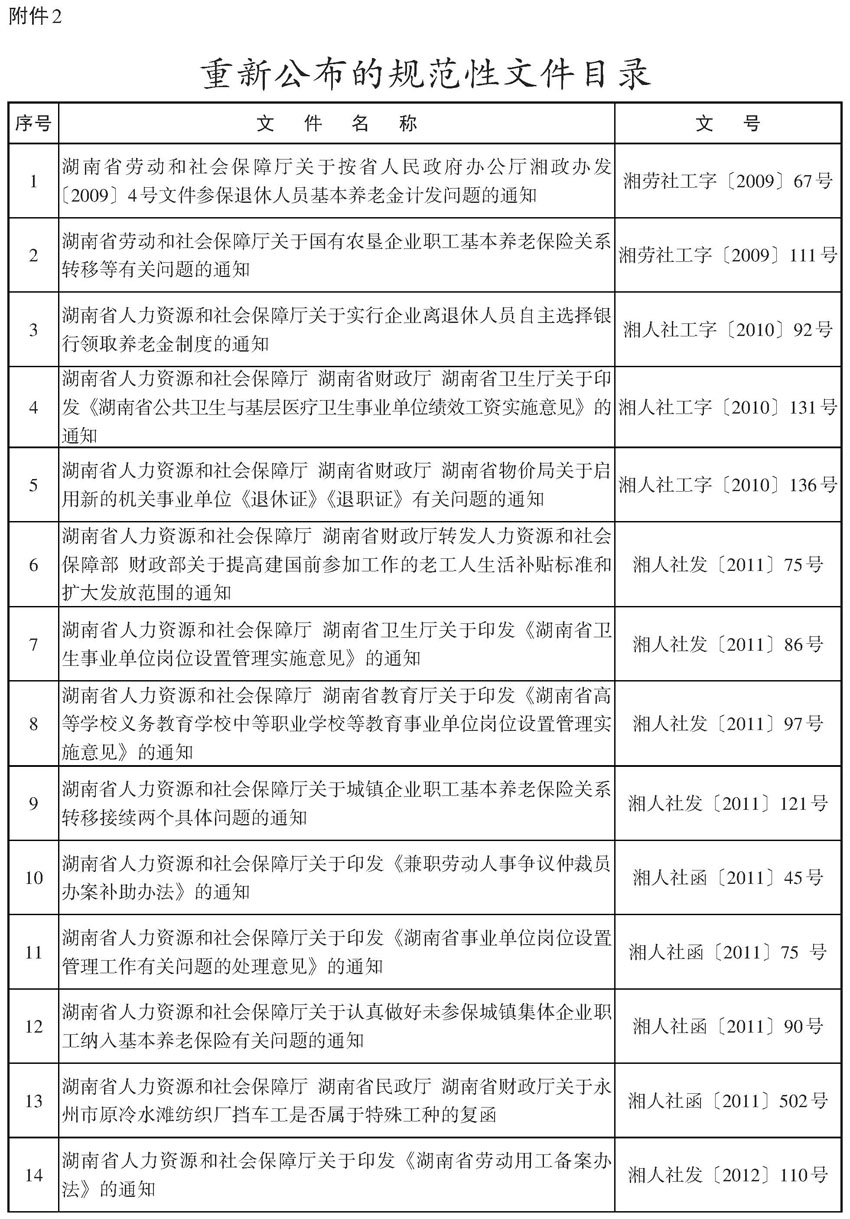 二、重新公布《湖南省勞動和社會保障廳關(guān)于按省人民政府辦公廳湘政辦發(fā)〔2009〕4號文件參保退休人員基本養(yǎng)老金計(jì)發(fā)問題的通知》等56件規(guī)范性文件。