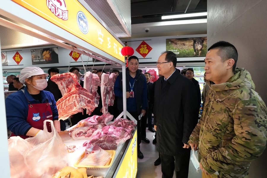 盒馬鮮生喜盈門店內(nèi),米面糧油、肉禽蛋奶、水果蔬菜等商品琳瑯滿目,前來置辦年貨的市民絡(luò)繹不絕。肉價(jià)菜價(jià)穩(wěn)不穩(wěn)、品種齊不齊全、貨源來自哪里……毛偉明向門店負(fù)責(zé)人詳細(xì)了解有關(guān)情況,叮囑要加強(qiáng)商品市場(chǎng)監(jiān)測(cè),豐富優(yōu)質(zhì)商品供給、暢通產(chǎn)運(yùn)銷調(diào)度銜接,確?!安嘶@子”“米袋子”“果盤子”數(shù)量充足、質(zhì)量放心、價(jià)格穩(wěn)定;要嚴(yán)格落實(shí)食品安全責(zé)任,加強(qiáng)從田間到餐桌的全流程監(jiān)管,讓廣大群眾吃得安心放心。