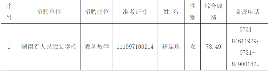 根據(jù)《湖南省省直事業(yè)單位2025年第三次集中公開招聘工作人員公告》有關(guān)要求,經(jīng)報名、資格審查、筆試、面試、體檢、考察等程序,確定楊瑞珍等1名同志為湖南省人力資源和社會保障廳所屬事業(yè)單位2025年公開招聘第二批擬聘用人員,現(xiàn)予以公示。
