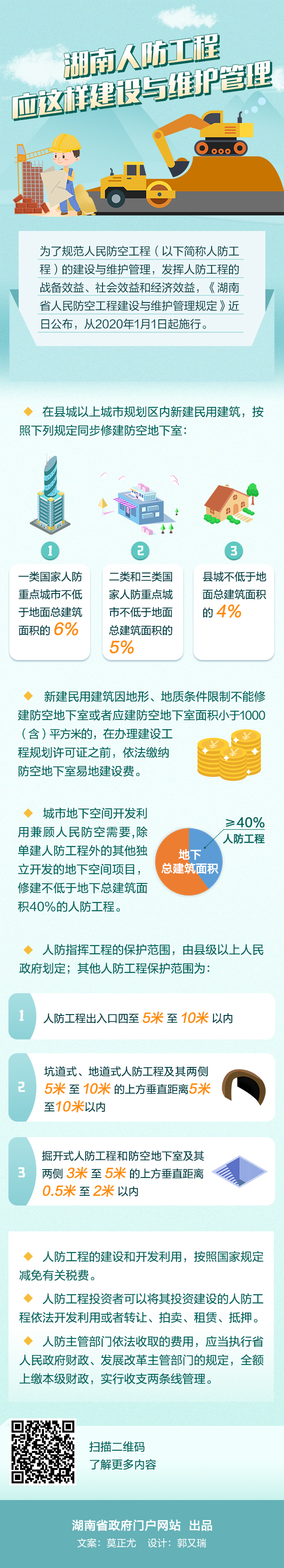 為了規(guī)范人民防空工程的建設(shè)與維護(hù)管理,發(fā)揮人防工程的戰(zhàn)備效益、社會(huì)效益和經(jīng)濟(jì)效益,《湖南省人民防空工程建設(shè)與維護(hù)管理規(guī)定》近日公布,從2020年1月1日起施行。