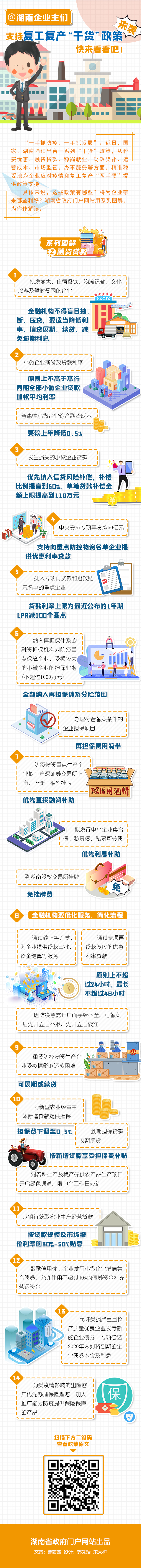 “一手抓防疫,一手抓發(fā)展”。近日,國家、湖南陸續(xù)出臺一系列“干貨”政策,從稅費優(yōu)惠、融資貸款、穩(wěn)崗就業(yè)、財政獎補(bǔ)、運營成本、市場監(jiān)管、辦事服務(wù)等方面,精準(zhǔn)穩(wěn)妥地為企業(yè)應(yīng)對疫情和復(fù)工復(fù)產(chǎn)“兩手硬”提供政策支持。