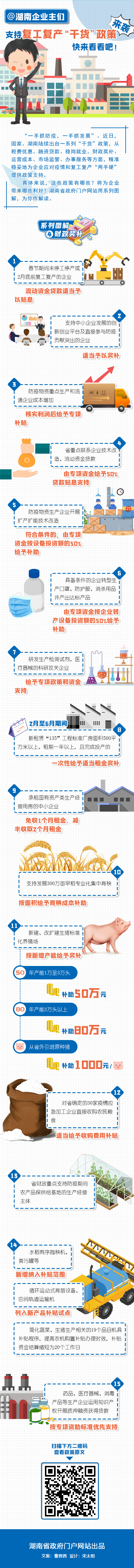 “一手抓防疫,一手抓發(fā)展”。近日,國家、湖南陸續(xù)出臺一系列“干貨”政策,從稅費(fèi)優(yōu)惠、融資貸款、穩(wěn)崗就業(yè)、財(cái)政獎(jiǎng)補(bǔ)、運(yùn)營成本、市場監(jiān)管、辦事服務(wù)等方面,精準(zhǔn)穩(wěn)妥地為企業(yè)應(yīng)對疫情和復(fù)工復(fù)產(chǎn)“兩手硬”提供政策支持。