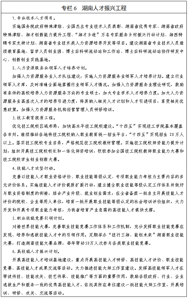2.加強專業(yè)技術人才隊伍建設。實行更加開放的人才政策,構筑集聚國內外優(yōu)秀專業(yè)技術人才的創(chuàng)新創(chuàng)業(yè)高地。加快培養(yǎng)集聚一批引領支撐高質量發(fā)展的高層次專業(yè)技術人才。繼續(xù)實施“國務院政府特殊津貼制度”“博士后創(chuàng)新人才支持計劃”“博士后國際交流計劃”“專業(yè)技術人才知識更新工程”等國家專業(yè)技術人才支持計劃,推動實施“湖南省政府特殊津貼制度”“湖湘博士后創(chuàng)新人才項目”“‘湘才鄉(xiāng)連’萬名專家服務鄉(xiāng)村振興行動計劃”“湘才創(chuàng)新能力提升工程”等省級重大工程,完善專業(yè)技術人才相關政策。加快完善博士后制度,建立健全專業(yè)技術人員繼續(xù)教育體系。優(yōu)化留學回湘人才工作服務。構建以頂尖人才引領、優(yōu)秀青年科技創(chuàng)新人才為主體、基層一線專業(yè)技術人才數(shù)量充沛的高素質專業(yè)人才隊伍。