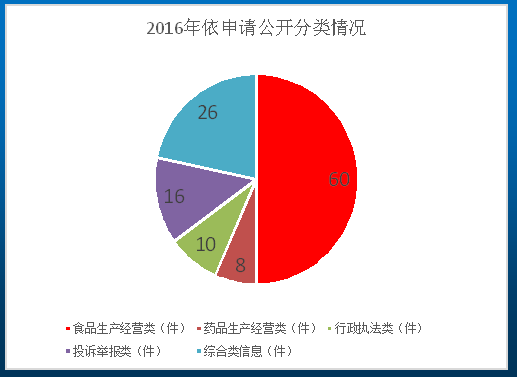 (一)受理情況。2016年省食品藥品監(jiān)督管理局共收到政府信息公開申請120件。從受理數(shù)量分析,2016年依申請公開總量比2015年增加46件,是2015年的1.62倍,這充分說明食品藥品集中統(tǒng)一監(jiān)管效能得以發(fā)揮,廣大群眾對食品藥品安全關(guān)注度越來越高。按申請人居所分析,省內(nèi)申請81件,省外申請39件,分別占依申請公開總量66.1%、33.9 %;按申請渠道分析,信函申請77件,網(wǎng)絡(luò)郵件申請40件,當面申請3件;從食藥監(jiān)管業(yè)務(wù)類別分析,食品生產(chǎn)經(jīng)營類60件,藥品生產(chǎn)經(jīng)營類8件,行政執(zhí)法類10件,投訴舉報類16件,其他綜合類信息26件,分別占依申請政府信息總量的50%、6.6%、8.3%、13.3%、21.8%。數(shù)據(jù)顯示:2016年依申請公開省內(nèi)多于省外;信函申請仍是依申請公開的主要渠道,網(wǎng)絡(luò)郵件成為依申請公開的快捷道;食品生產(chǎn)類信息依申請公開占大多數(shù),且呈上升趨勢。