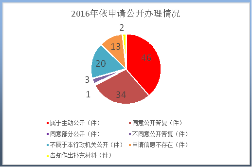 (二)辦理情況。2016年,省食品藥品監(jiān)督管理局共受理公開政府信息申請120件,其中,已依法按程序辦結(jié)119件(另有1件正在征求第3方意見)。根據(jù)《中華人民共和國政府信息公開條例》相關(guān)規(guī)定,在119件答復(fù)件中,屬于主動公開的46件,同意公開答復(fù)34件,同意部分公開的1件,不同意公開答復(fù)的3件(申請公開的信息不是《條例》所指的政府信息),不屬于本行政機關(guān)公開的20件,申請信息不存在的13件,告知作出補充材料的2件。從數(shù)據(jù)上分析,由于今年推行食品藥品行政審批制度改革,下放了一大批食品藥品、醫(yī)療器械行政審批許可項目,導(dǎo)致非本機關(guān)政府信息申請數(shù)量占比較大。