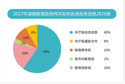 截至2017年12月底,湖南教育政務(wù)網(wǎng)發(fā)布各類政務(wù)信息共2826條,其中,廳委機(jī)關(guān)各處室、直屬各單位(不含直屬學(xué)校)共發(fā)布政務(wù)動態(tài)信息1687條、各類文件564個,各高等學(xué)校共發(fā)布信息67條,各市州教育局共發(fā)布信息280條,教育部新聞228條。制作維護(hù)信息公開專欄4個;通過教育政務(wù)網(wǎng)“高校信息公開”專欄公開錄取信息12條,考生服務(wù)信息9條;納入省本級教育部門預(yù)算管理的高校均按要求在省政府網(wǎng)站、湖南教育政務(wù)網(wǎng)及學(xué)校網(wǎng)站公開了2016年度部門決算和2017年度部門預(yù)算信息。