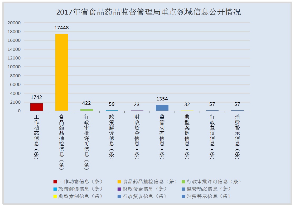 1.信息公開總體數量。2017年湖南省食藥監(jiān)局本級主動公開食藥監(jiān)管信息20901余條,比2016年增加2076條,同比增長11%,主要原因是2017年著力推進了食品藥品抽檢信息公開、行政許可處罰“雙公示”、食品藥品信用信息公開、消費警示、食藥科普等工作,政府信息主動公開數量大幅增長。