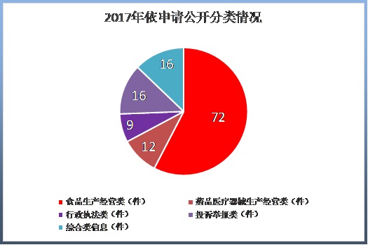 (一)受理情況。2017年1月1日至12月31日,湖南省食藥監(jiān)局共收到政府信息公開申請125件。按申請人居所分析,省內申請28件,省外申請97件,分別占依申請公開總量22.4%、77.6%;按申請渠道分析,當面申請1件,信函申請50件,網絡郵件申請74件,分別占依申請公開總量0.8%、40.0%、59.2%;從食藥監(jiān)管業(yè)務類別分析,食品生產經營類72件,藥品、醫(yī)療器械生產經營類12件,行政執(zhí)法類9件,投訴舉報類16件,其他綜合類信息16件,分別占依申請政府信息總量的57.6%、9.6%、7.2%、12.8%、12.8%。數據顯示:2017年依申請公開省外多于省內;網絡郵件已經超過信函申請,成為依申請公開的快捷道;食品生產類信息依申請公開占大多數,且呈上升趨勢。