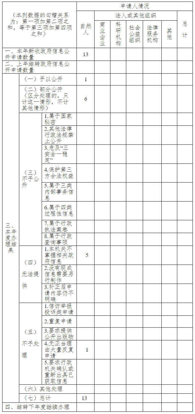 2020年,我局收到13人次自然人政府信息公開申請(qǐng),都給予了書面答復(fù)或電話溝通,引導(dǎo)和建議申請(qǐng)者向相關(guān)部門咨詢,依申請(qǐng)公開件按時(shí)辦結(jié)率100%。