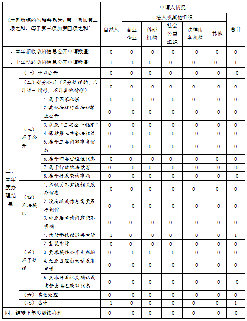 (二)依申請公開政府信息情況。2020年我局辦理政府信息公開申請1件,該件2019年底收到,結(jié)轉(zhuǎn)至2020年辦理,按照依法有據(jù)、嚴(yán)謹(jǐn)規(guī)范、慎重穩(wěn)妥原則及時回復(fù)、依法辦結(jié)。