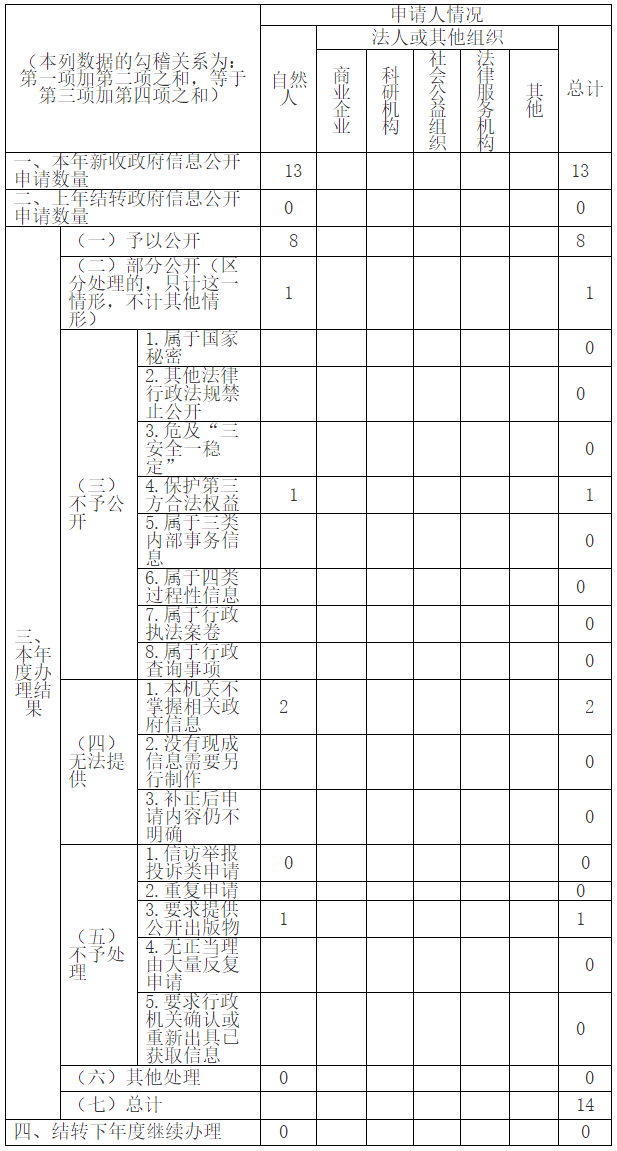 本年度報(bào)告根據(jù)《中華人民共和國政府信息公開條例》(國務(wù)院令第711號)(以下簡稱“條例”)編制,由總體情況、主動公開政府信息情況、收到和處理政府信息公開申請情況、政府信息公開行政復(fù)議和行政訴訟情況、存在的主要問題及改進(jìn)情況、其他需要報(bào)告的事項(xiàng)六個(gè)部分組成。報(bào)告所列統(tǒng)計(jì)數(shù)據(jù)的期限自2020年1月1日至2020年12月31日。如對本報(bào)告有疑義,請與湖南省民政廳政務(wù)公開領(lǐng)導(dǎo)小組辦公室聯(lián)系(地址:長沙市東風(fēng)路276號,聯(lián)系電話:0731-84502009)。