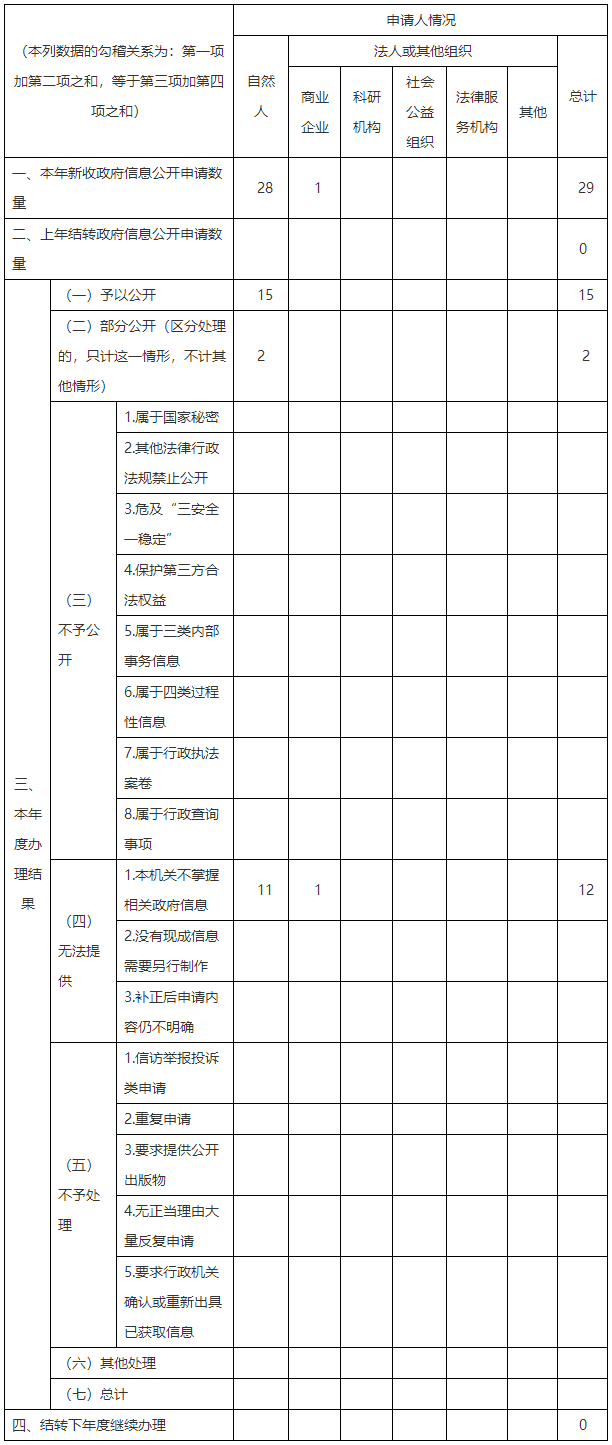 收到政府信息公開(kāi)申請(qǐng)29件,對(duì)29件依申請(qǐng)公開(kāi)全部依法辦理。其中,同意公開(kāi)答復(fù)15件;同意部分公開(kāi)答復(fù)2件;本機(jī)關(guān)不掌握相關(guān)政府信息12件。