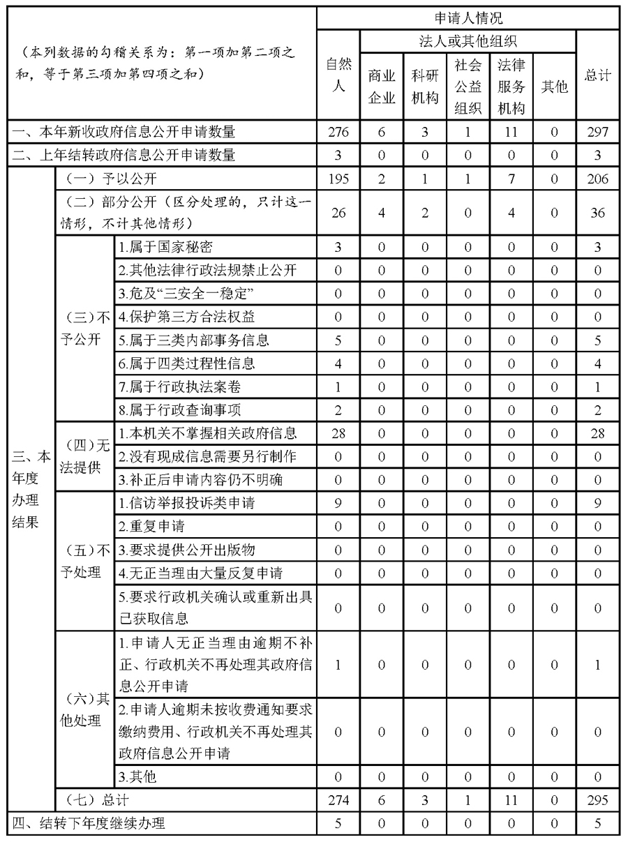 (二)依申請公開情況。嚴(yán)格執(zhí)行政府信息公開條例有關(guān)依申請公開的規(guī)定,依法辦理政府信息公開申請件。2022年收到政府信息公開申請297件,結(jié)轉(zhuǎn)上年度政府信息公開申請3件,共辦理完成295件,結(jié)轉(zhuǎn)下年度繼續(xù)辦理5件;發(fā)生行政復(fù)議3件,其中3件維持;發(fā)生行政訴訟5件,其中3件維持,2件尚未審結(jié)。