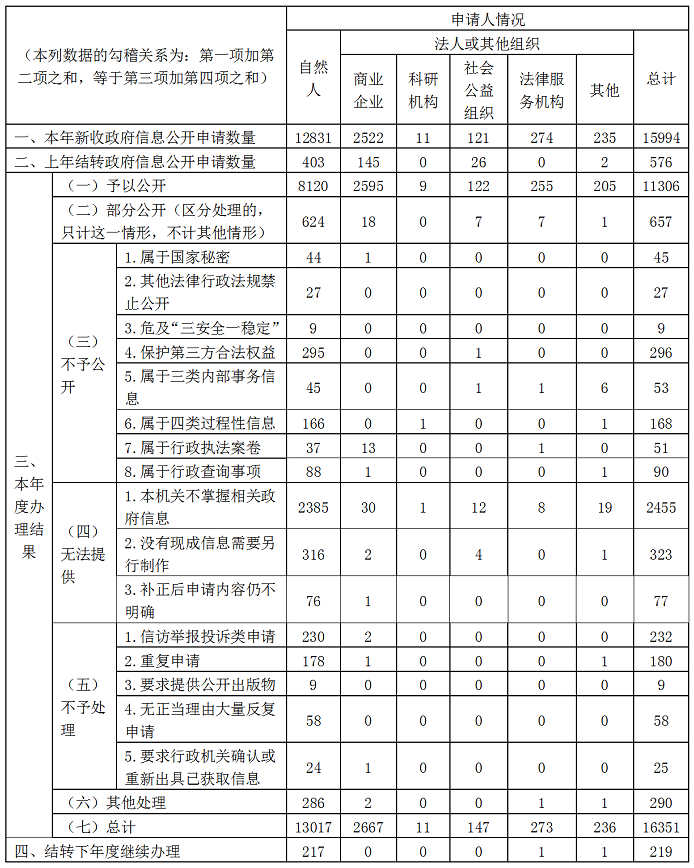 (二)依法辦理政府信息公開申請。各級各部門堅持合法、便民的原則,對公民、法人和其他組織申請公開政府信息能提供的積極提供,不能提供的依法做好答復說明。2019年全省共收到依申請公開件15994件,上年度結(jié)轉(zhuǎn)辦理件576件,共辦理完成16351件,結(jié)轉(zhuǎn)到2020年辦理219件。其中,省政府辦公廳(政務局)2019年收到依申請公開235件,辦理完成225件,結(jié)轉(zhuǎn)到2020年辦理10件;發(fā)生行政復議1件,暫未審結(jié);發(fā)生行政訴訟5件,已經(jīng)審結(jié)4件,沒有發(fā)生敗訴情形。