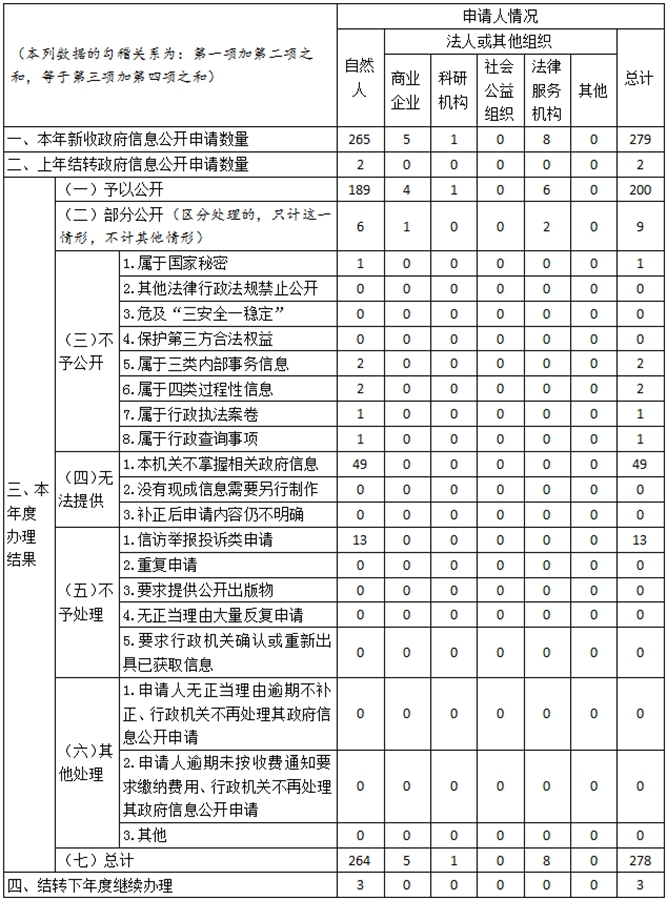 (二)依申請(qǐng)公開情況。嚴(yán)格執(zhí)行政府信息公開條例有關(guān)依申請(qǐng)公開的規(guī)定,依法辦理政府信息公開申請(qǐng)件。2021年收到政府信息公開申請(qǐng)279件,結(jié)轉(zhuǎn)上年度政府信息公開申請(qǐng)2件,共辦理完成278件,結(jié)轉(zhuǎn)下年度繼續(xù)辦理3件;發(fā)生行政復(fù)議9件,其中8件維持,1件尚未審結(jié);發(fā)生行政訴訟4件,其中3件維持,1件尚未審結(jié)。