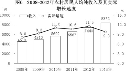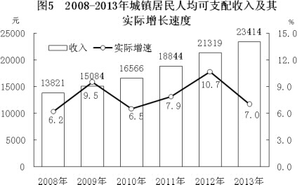 全省城鎮(zhèn)居民人均可支配收入23414元,比上年增長(zhǎng)9.8%;扣除價(jià)格因素,實(shí)際增長(zhǎng)7.0%;農(nóng)村居民人均純收入8372元,增長(zhǎng)12.5%;扣除價(jià)格因素,實(shí)際增長(zhǎng)9.8%。城鎮(zhèn)居民人均消費(fèi)性支出15887元,增長(zhǎng)8.7%;農(nóng)村居民人均生活消費(fèi)支出6609元,增長(zhǎng)12.6%。城鎮(zhèn)居民食品消費(fèi)支出占消費(fèi)總支出的比重(恩格爾系數(shù))為35.1%,農(nóng)村為38.4%。