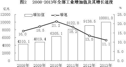 全省全部工業(yè)增加值10001.0億元,比上年增長(zhǎng)11.1%。規(guī)模以上工業(yè)增加值增長(zhǎng)11.6%。規(guī)模以上工業(yè)新產(chǎn)品產(chǎn)值增長(zhǎng)23.2%,占工業(yè)總產(chǎn)值比重為13.1%,比上年提高1個(gè)百分點(diǎn)。規(guī)模以上高加工度工業(yè)和高技術(shù)產(chǎn)業(yè)增加值分別增長(zhǎng)14.1%和27.3%;增加值占規(guī)模以上工業(yè)的比重分別為35.6%和9.0%,比上年提高1個(gè)和1.5個(gè)百分點(diǎn)。六大高耗能行業(yè)增加值增長(zhǎng)12.8%,占規(guī)模以上工業(yè)的比重為31.6%。非公有制規(guī)模以上工業(yè)增加值增長(zhǎng)14.7%。長(zhǎng)株潭城市群規(guī)模以上工業(yè)增加值增長(zhǎng)13.2%,環(huán)長(zhǎng)株潭城市群增長(zhǎng)12.5%,湘南地區(qū)增長(zhǎng)12.0%,大湘西地區(qū)增長(zhǎng)9.4%,洞庭湖生態(tài)經(jīng)濟(jì)區(qū)增長(zhǎng)12.1%。