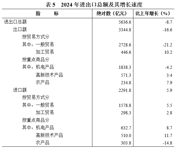 全年進出口總額[21]5636.6億元,比上年下降8.7%。其中,出口3344.8億元,下降16.6%;進口2291.8億元,增長5.9%。分貿(mào)易方式看,一般貿(mào)易出口2728.6億元,下降21.2%;加工貿(mào)易出口446.6億元,增長10.2%。重點出口商品中,機電產(chǎn)品1838.3億元,下降4.2%;高新技術產(chǎn)品571.3億元,增長3.4%。分產(chǎn)銷國別(地區(qū))看,出口美國314.6億元,下降30.1%;出口中國香港463.0億元,下降13.7%;出口歐盟[22]326.1億元,下降8.3%;出口東盟599.4億元,下降21.3%;出口共建“一帶一路”[23]國家1879.4億元,下降16.0%。