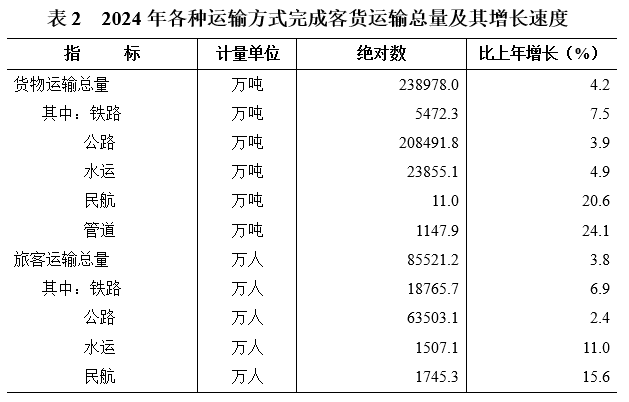 [8]貨物運輸總量及周轉(zhuǎn)量包括鐵路、公路、水路、民航和管道五種運輸方式完成量,2024年增速按可比口徑計算。