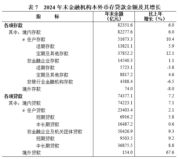 年末金融機構本外幣各項存款余額82351.6億元,比上年末增長6.0%。其中,住戶存款余額51673.3億元,增長10.4%;非金融企業(yè)存款余額14540.3億元,增長1.1%。本外幣各項貸款余額74377.1億元,增長7.2%。其中,住戶貸款余額23403.4億元,增長2.1%;非金融企業(yè)及機關團體貸款余額50426.9億元,增長9.3%。