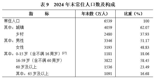年末全省常住人口6539萬人。其中,城鎮(zhèn)人口4059萬人,城鎮(zhèn)化率62.07%,比上年末提高0.91個百分點。全年出生人口38.6萬人,出生率5.89‰;死亡人口58.5萬人,死亡率8.93‰;人口自然增長率-3.04‰。0-15歲(含不滿16周歲)人口占常住人口的比重為18.06%,下降0.78個百分點;16-59歲(含不滿60周歲)人口比重為58.45%,下降0.48個百分點;60歲及以上人口比重為23.49%,提高1.26個百分點。
