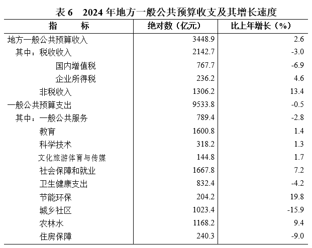 全年地方一般公共預算收入3448.9億元,比上年增長2.6%。其中,稅收收入2142.7億元,下降3.0%;非稅收入1306.2億元,增長13.4%。稅收收入中,國內(nèi)增值稅767.7億元,下降6.9%;企業(yè)所得稅236.2億元,增長4.6%。一般公共預算支出9533.8億元,下降0.5%。其中,教育支出1600.8億元,增長1.4%;社會保障和就業(yè)支出1667.8億元,增長7.2%;衛(wèi)生健康支出832.4億元,下降4.2%;科學技術支出318.2億元,增長1.3%;住房保障支出240.3億元,下降9.0%。