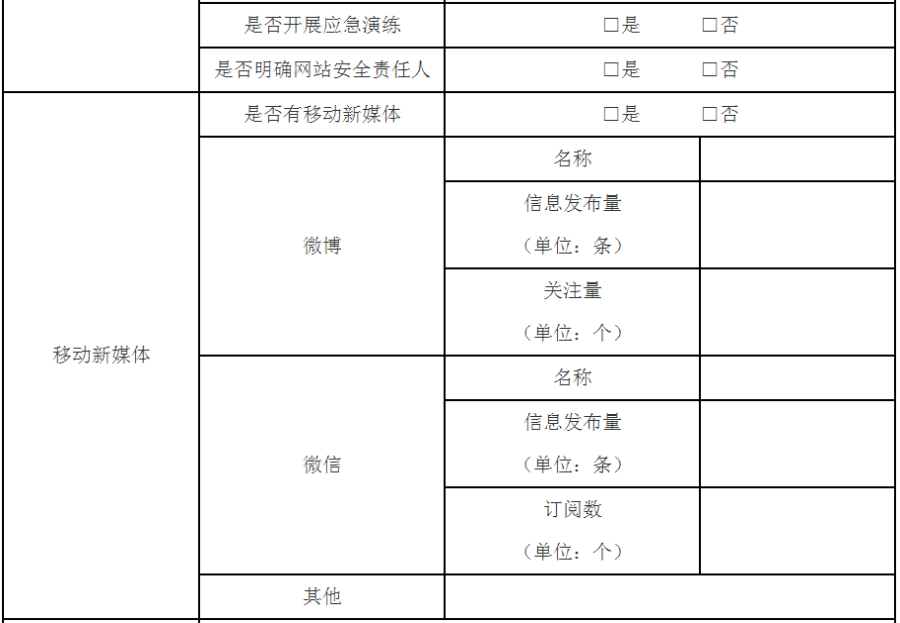 1.是否有移動(dòng)新媒體:網(wǎng)站主辦單位是否保障移動(dòng)新媒體,請(qǐng)勾選“是”或“否”。如勾選“是”,請(qǐng)?zhí)顚憽拔⒉?、“微信”、“其他”?xiàng)目。