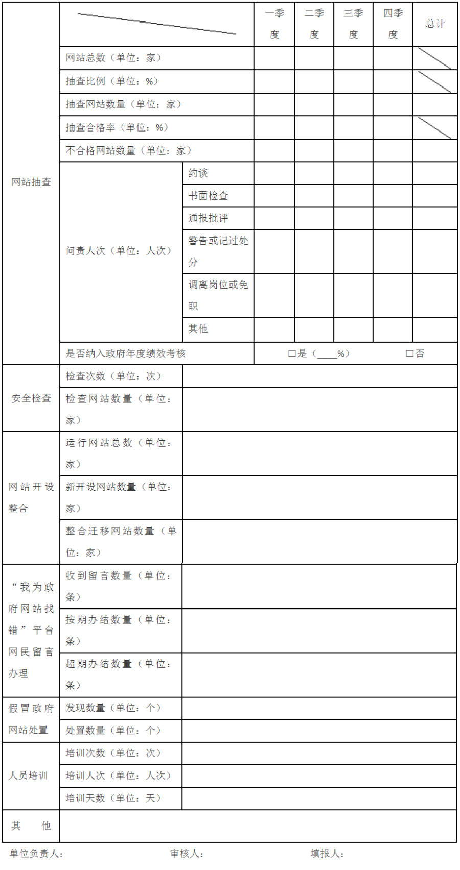 6.問(wèn)責(zé)人次:請(qǐng)分別填寫(xiě)每個(gè)季度問(wèn)責(zé)的不合格網(wǎng)站或整改不到位網(wǎng)站有關(guān)責(zé)任人的人次和全年問(wèn)責(zé)的不合格網(wǎng)站或整改不到位網(wǎng)站有關(guān)責(zé)任人的總?cè)舜巍?/p>