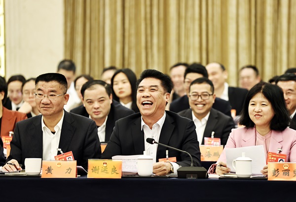 “這個建議很重要,莽山是旅游勝地,就差一個高鐵站?!?月14日下午,郴州市代表團謝運良代表(前排中)在發(fā)言中提出建議,希望宜章也能享受高鐵交通帶來的便利,引得現(xiàn)場代表會心歡笑。湖南日報全媒體記者 劉尚文 攝