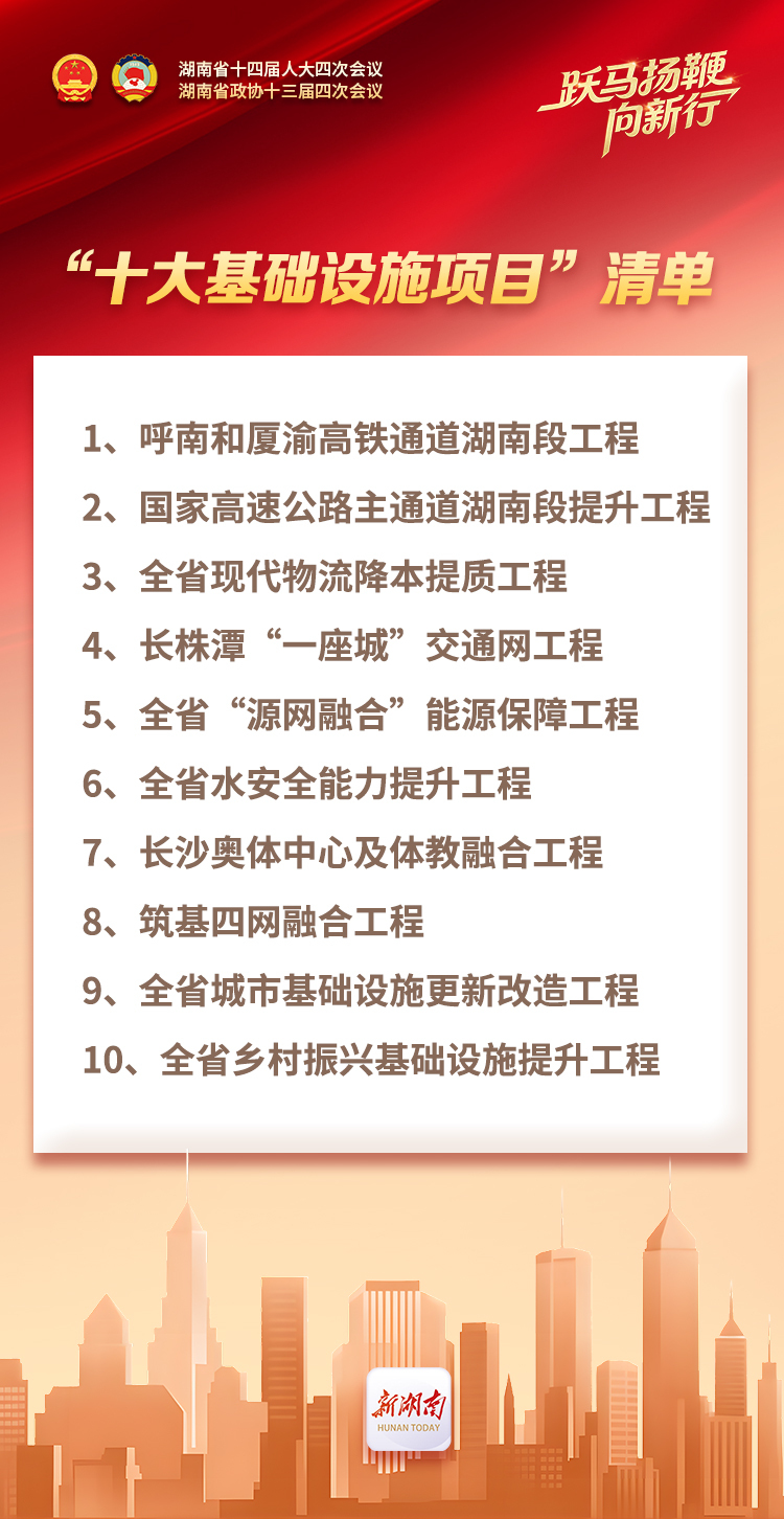 2026年湖南將持續(xù)開展“項目大謀劃、謀劃大項目”,抓好總投資2萬億元的389個省重點項目,推進能源“源網(wǎng)荷儲”一體工程、算力“四網(wǎng)融合”工程、城市基礎設施更新改造工程等“十大基礎設施項目”建設。加快邵永、銅吉、長贛、宜常、永清廣、黔吉等6條高鐵,京港澳和滬昆擴容、張官等17條高速公路,以及梅山灌區(qū)、金塘沖水庫等重大水利工程建設。