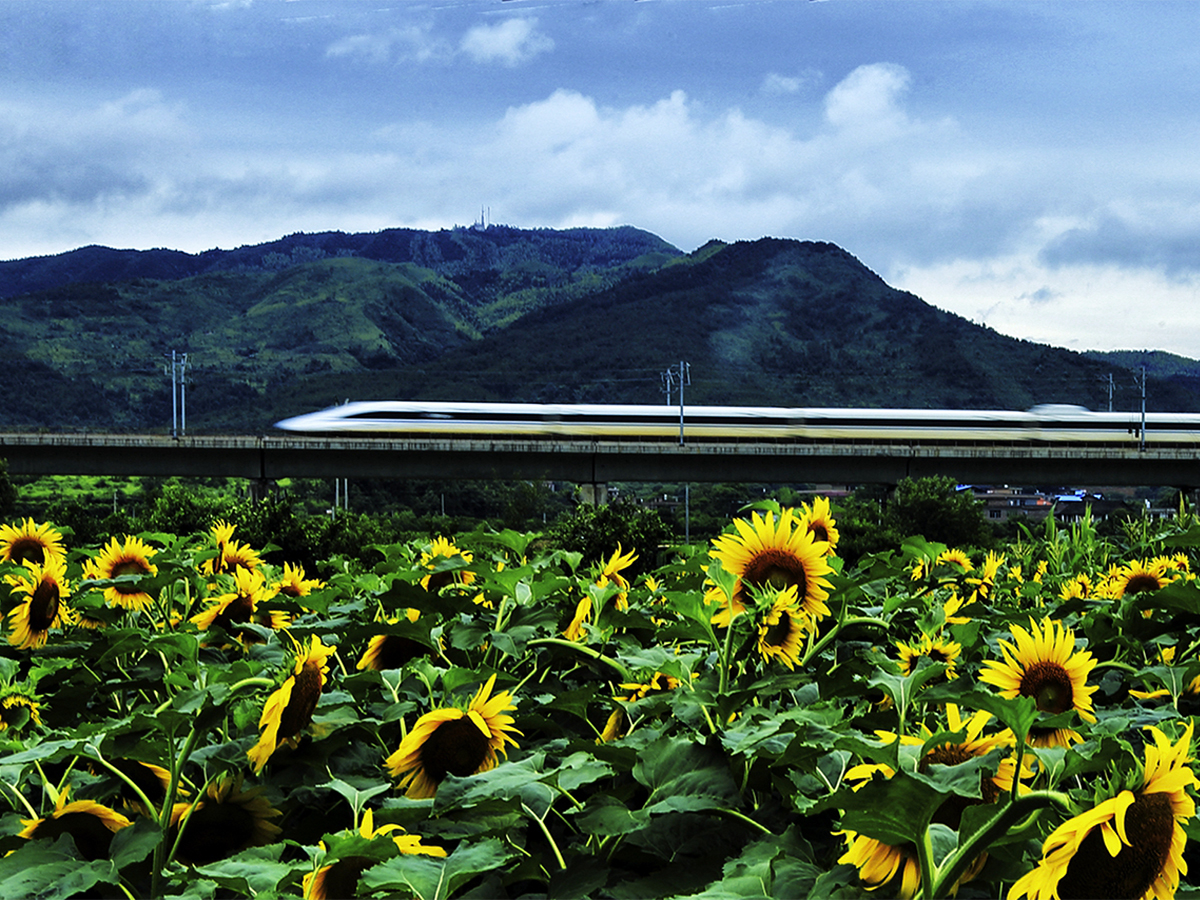 該圖以盛開的向日葵為前景,以高速運(yùn)行的動(dòng)車為主體,以祁山山脈、藍(lán)天白云為背景,運(yùn)用動(dòng)靜結(jié)合、虛實(shí)對(duì)比、色彩搭配協(xié)調(diào)等攝影表現(xiàn)手法,展現(xiàn)湖南祁陽(yáng)的發(fā)展之美、生態(tài)之美。
