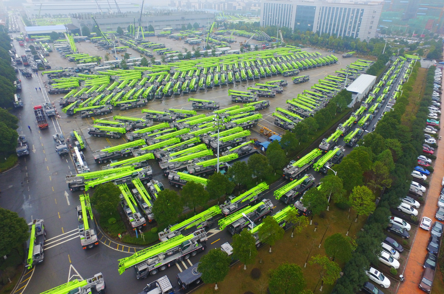 中聯(lián)重科泉塘工業(yè)園,各型號工程起重機有序駛出園區(qū),發(fā)往河南、深圳、江蘇等地。