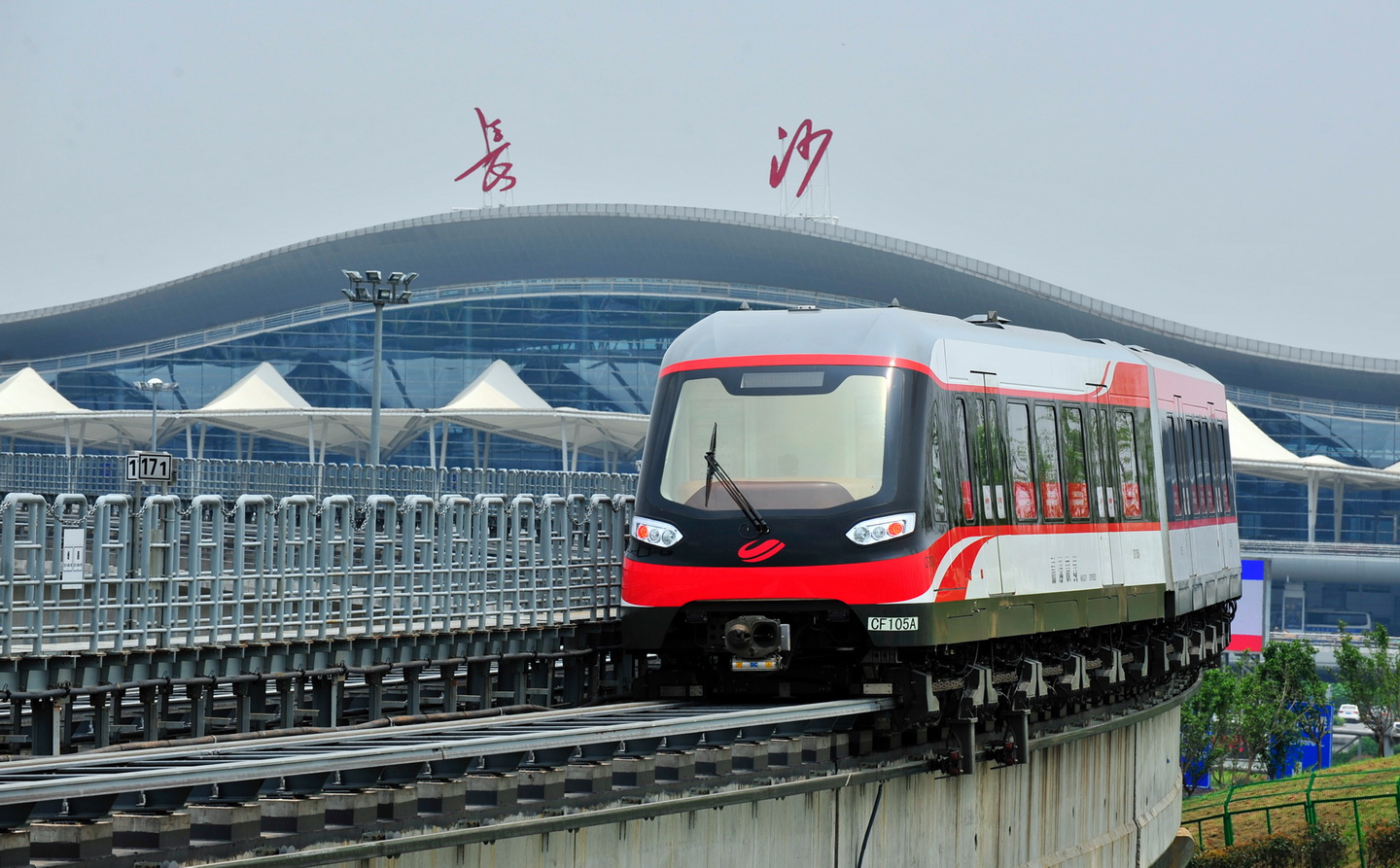 長(zhǎng)沙市黃花機(jī)場(chǎng),一輛磁浮列車(chē)即將駛?cè)氪鸥C(jī)場(chǎng)站。