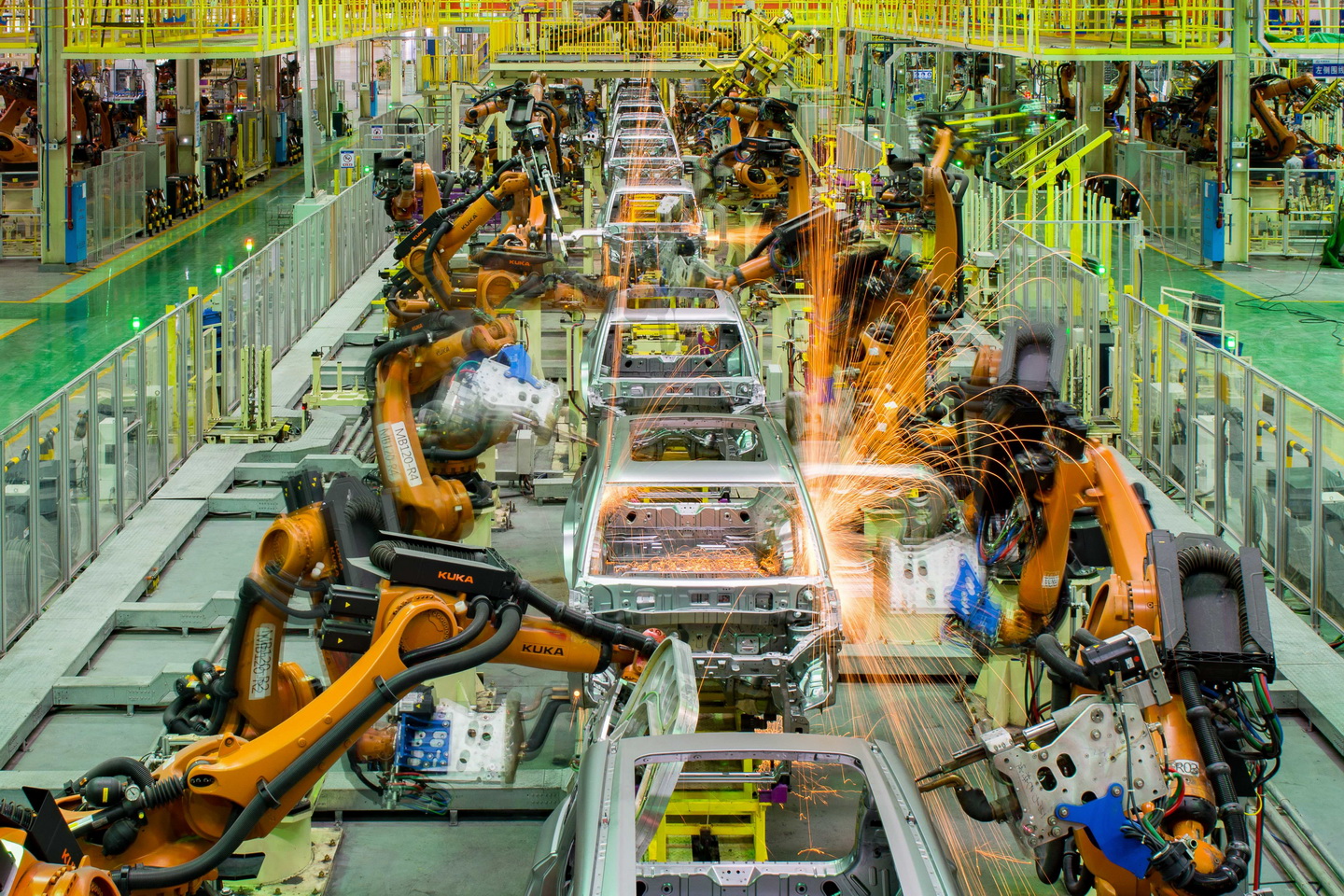 獵豹汽車長(zhǎng)沙公司焊裝車間自動(dòng)化生產(chǎn)線上,機(jī)器人靈活、準(zhǔn)確地焊接車身。