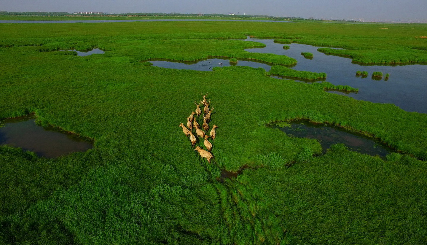 麋鹿群奔跑在東洞庭湖國家級自然保護(hù)區(qū)內(nèi)。