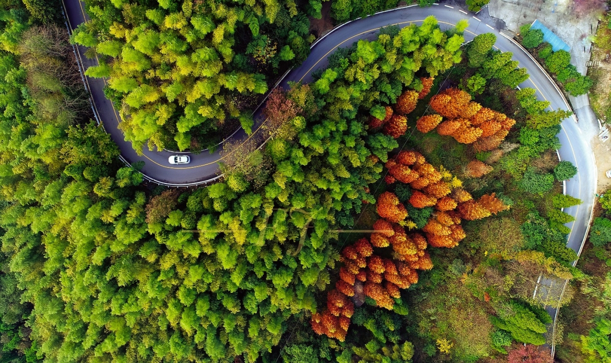 南岳西嶺鄉(xiāng)間公路上,西嶺為南岳登山起點(diǎn)之一,沿途山路彎彎、景色優(yōu)美,有得天獨(dú)厚的植被、水系等資源,更有黃庭觀、十里茶鄉(xiāng)、“南岳四絕”之一的“方廣寺之深”、原始次生林等景點(diǎn),平均海拔在800米以上。駕車行駛在路上,當(dāng)翠綠的竹林才開(kāi)始微微帶黃的時(shí)候,旁邊的水杉已經(jīng)告訴你:秋天到了。