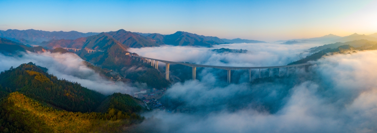 2017年11月27日清晨,婁懷(婁底至懷化)高速溆浦縣三江鎮(zhèn)三江特大橋,青山如黛、云蒸霞蔚如仙境,大橋仿佛天路入云端,美不勝收。