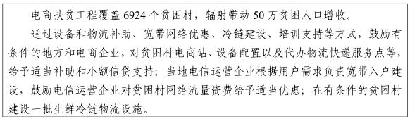 加強(qiáng)貧困地區(qū)互聯(lián)網(wǎng)和物流基礎(chǔ)設(shè)施建設(shè)。實(shí)施貧困地區(qū)中小城市基礎(chǔ)設(shè)施網(wǎng)絡(luò)完善工程,推進(jìn)貧困縣骨干網(wǎng)、城域網(wǎng)擴(kuò)容提速以及光網(wǎng)化改造,優(yōu)化寬帶網(wǎng)絡(luò)結(jié)構(gòu)和性能,提升信息化扶貧能力。建設(shè)精準(zhǔn)扶貧大數(shù)據(jù)平臺(tái),實(shí)施"互聯(lián)網(wǎng)+精準(zhǔn)扶貧"工程。支持在武陵山、羅霄山等貧困地區(qū)省際邊界城鎮(zhèn)建設(shè)一批商貿(mào)物流中心,形成輻射面寬、帶動(dòng)力強(qiáng)的區(qū)域物流節(jié)點(diǎn)。支持貧困地區(qū)建設(shè)一批區(qū)域性倉(cāng)儲(chǔ)配送基地。扶持農(nóng)產(chǎn)品冷鏈物流基礎(chǔ)設(shè)施建設(shè),完善產(chǎn)業(yè)預(yù)冷、銷地冷藏和保鮮運(yùn)輸、保鮮加工等設(shè)施,努力實(shí)現(xiàn)農(nóng)產(chǎn)品冷鏈物流全覆蓋。支持貧困地區(qū)物流通道、園區(qū)、口岸、配送中心等基礎(chǔ)設(shè)施建設(shè),增強(qiáng)區(qū)域物流節(jié)點(diǎn)綜合服務(wù)功能。
