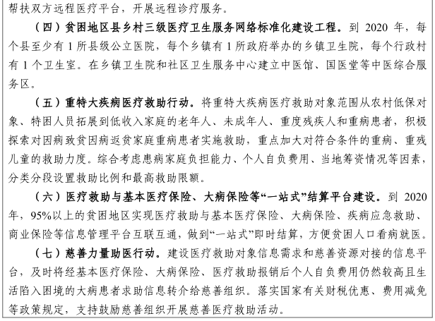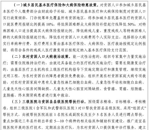 加大醫(yī)療保險(xiǎn)與救助保障力度。對(duì)貧困人口參加城鄉(xiāng)居民基本醫(yī)療保險(xiǎn)個(gè)人繳費(fèi)部分由財(cái)政通過城鄉(xiāng)醫(yī)療救助給予補(bǔ)貼。城鄉(xiāng)居民基本醫(yī)療和大病保險(xiǎn)制度對(duì)貧困人口實(shí)行政策傾斜,門診統(tǒng)籌率先覆蓋所有貧困地區(qū),提高政策范圍內(nèi)住院費(fèi)用報(bào)銷比例。城鄉(xiāng)居民基本醫(yī)療保險(xiǎn)新增籌資主要用于提高城鄉(xiāng)居民基本醫(yī)療保障水平,逐步降低貧困人口大病保險(xiǎn)起付線。將符合條件的貧困人口全部納入重特大疾病救助范圍。對(duì)通過城鄉(xiāng)居民基本醫(yī)療、大病保險(xiǎn)支付和醫(yī)療救助后自負(fù)費(fèi)用仍有困難的,加大臨時(shí)救助力度。支持引導(dǎo)社會(huì)慈善力量參與醫(yī)療救助。加大農(nóng)村貧困殘疾人醫(yī)療救助力度。在貧困地區(qū)先行推進(jìn)以按病種付費(fèi)為主的醫(yī)保支付方式改革,逐步擴(kuò)大病種范圍。