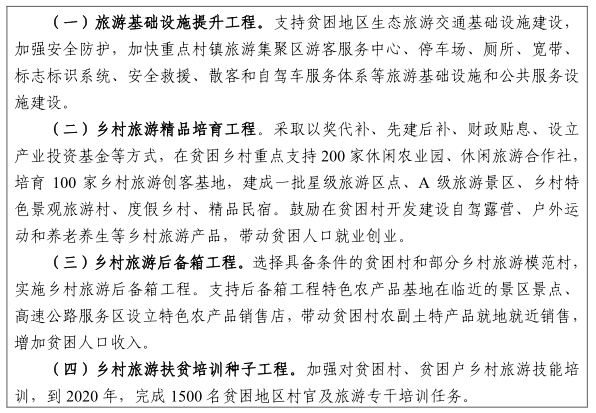 加快實(shí)施鄉(xiāng)村旅游項(xiàng)目。支持貧困縣開發(fā)優(yōu)質(zhì)旅游資源,重點(diǎn)支持貧困縣鄉(xiāng)村旅游扶貧示范項(xiàng)目建設(shè),通過因地制宜規(guī)劃旅游開發(fā)項(xiàng)目,開發(fā)具有競(jìng)爭(zhēng)優(yōu)勢(shì)的旅游產(chǎn)品,吸引外來投資,與貧困戶建立緊密利益聯(lián)結(jié)機(jī)制。加強(qiáng)旅游基礎(chǔ)設(shè)施及配套服務(wù)設(shè)施建設(shè),實(shí)施休閑農(nóng)業(yè)與旅游基礎(chǔ)設(shè)施提升工程、鄉(xiāng)村旅游精品培育工程、鄉(xiāng)村旅游后備箱工程等一批旅游扶貧重點(diǎn)工程。